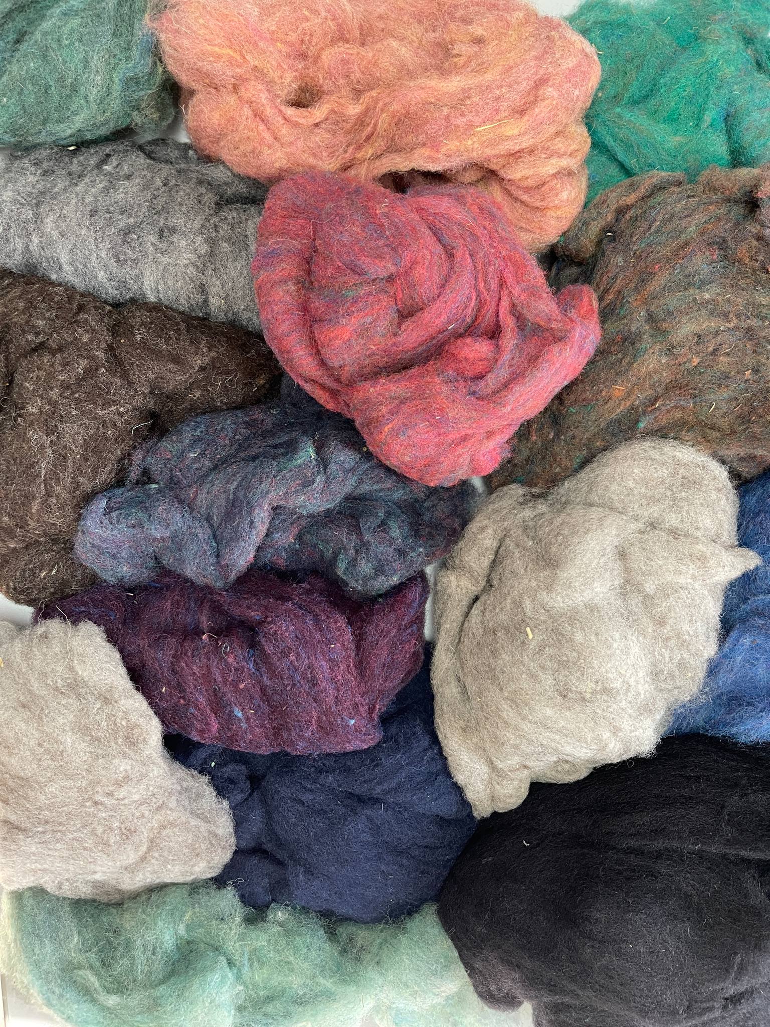 Our carded wool is 100% pure sheep wool, that has been carded/brushed to organize the fibers.